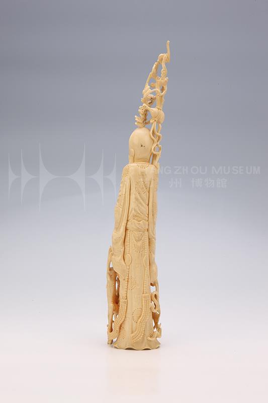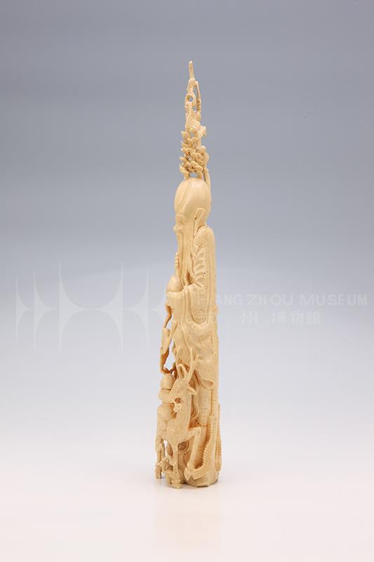 牙雕摆件应为上层贵族或富贵之家几案上的陈设珍玩。牙雕是我国传统手工技艺之一,将象牙雕刻成各种实用器或艺术品,以其润泽典雅的风貌深受世人喜爱。明清时期,由于人们的审美和文化意识增强,宫廷贵族与上层社会对高质量牙雕制品的需求,促使牙雕技艺精益求精。清代是我国牙雕工艺发展的鼎盛时期,制作技法多样,雕工极其讲究,制作中多利用象牙本体自然弯曲的造型,顺势雕刻出各类形象,以人物造型最为出色,常见的有观音、寿星、八仙、十八罗汉等,整体构图繁缛而细节处理精致。作为长寿之神与福康象征的寿星,浑身弥漫吉祥如意的气息,至今受到民间的追捧。